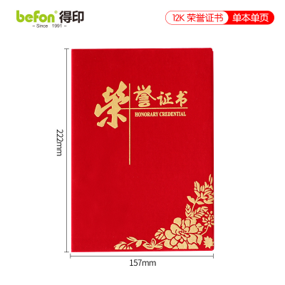 得印(befon) 12K绒面烫金荣誉证书单本装 奖状证书封皮获奖证书外壳 表彰奖励当选先进个人证书附a4内芯(本)