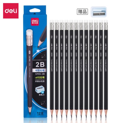 得力S955-2B_黑杆办公皮头2B铅笔(黑)(12支/盒)