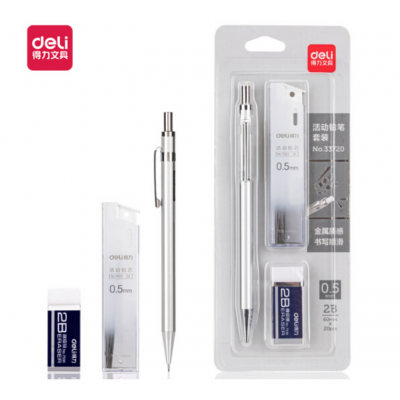 得力33720(deli)0.5mm/2B金属活动铅笔套装 自动铅笔+橡皮+替芯