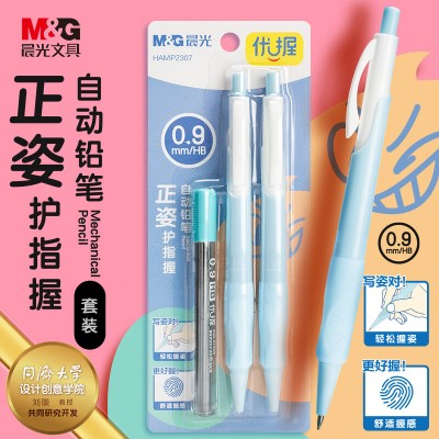 晨光(M&G)文具0.9mm儿童正姿护指握自动铅笔套装 小学生优握练字笔 轻松舒适 2支装 铅芯HAMP2307B蓝色