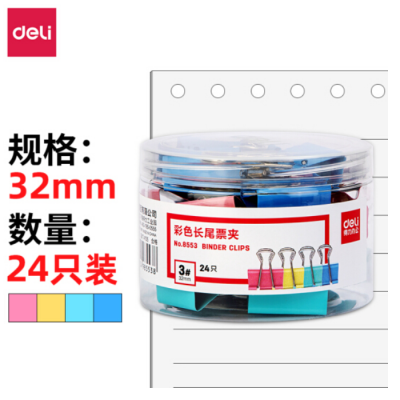 首页 > 办公用品 > 文具 > 得力(deli) 8556 6# 60只15mm彩色长尾夹票夹